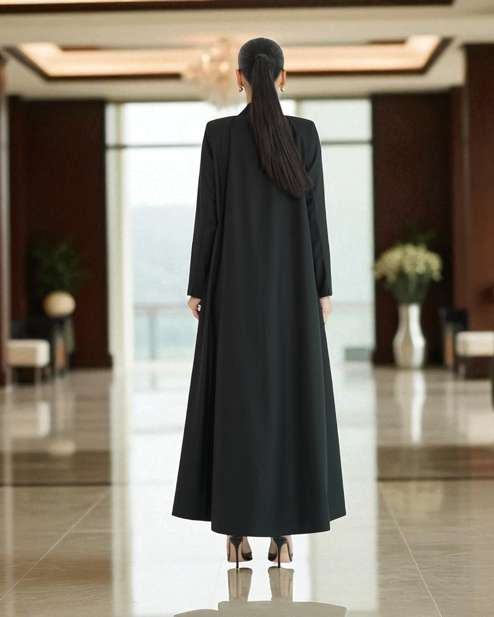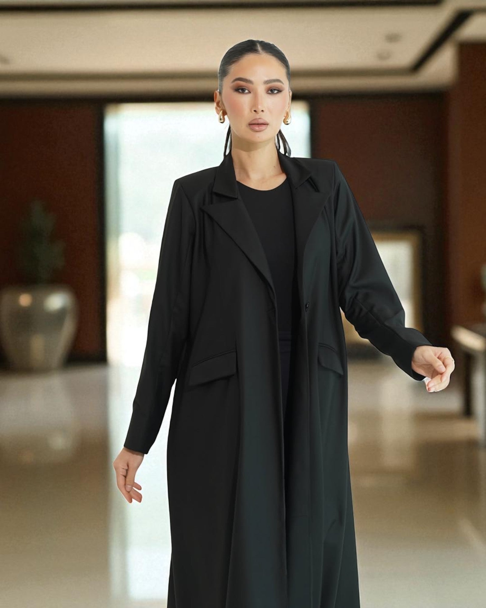 This blazer-inspired trendy abaya redefines modest fashion with a perfect balance of power and grace. Crafted from premium Firdaus fabric, it offers a smooth yet structured drape that moves elegantly with every step. The tailored lapel collar and single-button closure lend it a refined, modern edge, while the long, flowing silhouette keeps the essence of modesty intact. Functional side pockets are seamlessly integrated, adding practicality without compromising the clean design. The rich black tone enhances its versatility, making it ideal for both everyday sophistication and elevated evening wear. A true statement piece for women who want modest attire that feels empowering, timeless, and effortlessly chic.